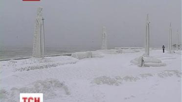 Там мороз и морская вода создали ледовые скульптуры. В последние дни температура в городе резко снизилась, волны постепенно замерзали. В конце концов, торговые павильоны превратились во дворцы, а перила набережной стали напоминать сказочные ограждения.