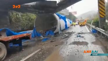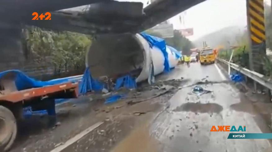 Секция колонны ветрогенератора, которую перевозили на прицепе, оказалась слишком велика и обрушила прогон моста. Лишь чудом автомобили, ехавшие рядом, не попали под завал. В конце концов, пострадал только бетон. Полные выпуски смотрите на 1+1 video