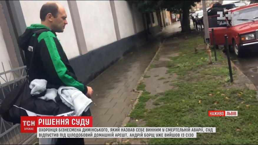 Охранника бизнесмена Дыминского суд выпустил под домашний арест Андрей Борщ, который взял на себя вину за смертельное ДТП, вышел из СИЗО. ТСН удалось снять эксклюзивное видео и спросить мужчину о ДТП, но он проигнорировал журналистов. Пока не известно, кто был за рулем авто, повлекшее смертельное ДТП, ведь результатов экспертизы до сих пор не обнародовали.