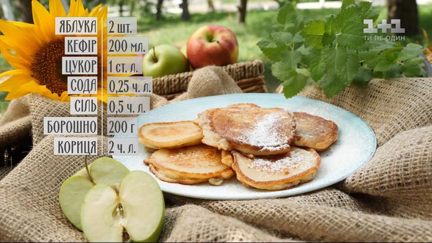 Уже успели насладиться вкусом и ароматом яблок нового урожая? Руслан Сеничкин сегодня будет готовить с ними оладьи - и это будет настоящая вкуснятина! Записывайте рецепт, вам понадобится: яблоки - 2 шт., кефир - 200 мл., сахар - 1 ст. л., сода - 0, 25 ч. л., соль - 0,5 ч. л., мука - 200 г, корица - 2 ч. л.