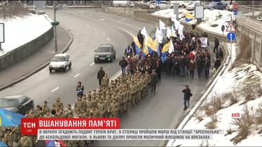 Ровно сто лет назад отряд из четырех сотен киевских курсантов приостановил наступление четырехтысячного подразделения красной гвардии на Киев. В столице в честь героев активисты прошлись маршем - от Арсенальной к Аскольдовой могиле. Во Львове и Днепре устроили флешмоб на вокзале: военный оркестр там выполнял марши и стрелецкие песни.