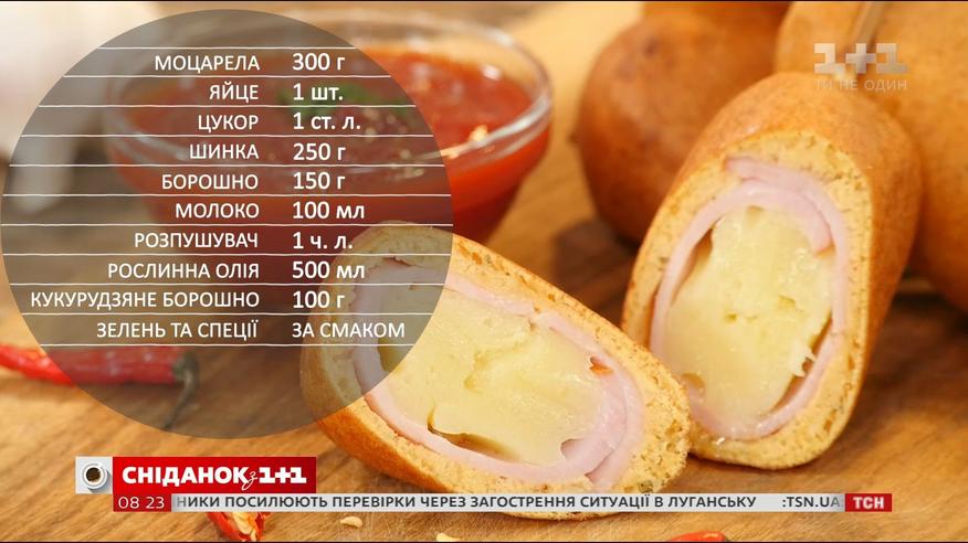 Корн-дог - это классика уличной еды. Руслан Сеничкин несколько изменил традиционный рецепт, и получились очень вкусно. Записывайте, вас понадобится: моцарелла - 300 г, яйцо - 1 шт, сахар - 1 ст. л., ветчина - 250 г, мука - 150 г, молоко - 100 мл, разрыхлитель - 1 ч. л., растительное масло - 500 мл, кукурдзяне мука - 100 г, зелень и специи - по вкусу.