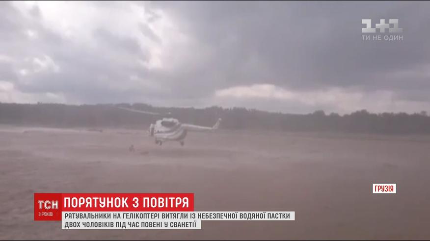 Происшествие произошло на западе Грузии. Мужчины оказались прямо посреди реки, что разлилась во время потопа. С берега помощи ждать было бесполезно, спасатели бы не добрались до людей из-за слишком сильного потока. Экипажа вертолету пришлось продемонстрировать все свое мастерство, чтобы спустить многотонную машину рядом с пострадавшими.