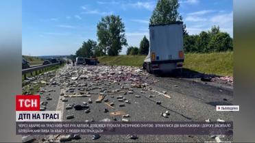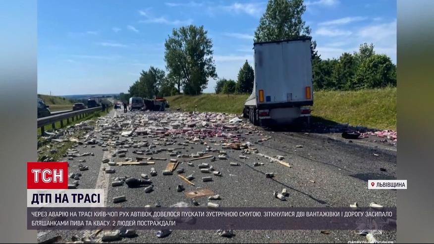 Трассу Киев-Чоп засыпало банками пива и кваса. На Львовщине столкнулись два грузовика. 52-летний водитель и его 56-летняя пассажирка получили телесные повреждения. От удара кабину у одной из фур оторвало и отбросило на несколько метров. А пиво и квас из поврежденного прицепа швырнуло по всей трассе. Три часа движение здесь было заблокировано, полицейские организовали проезд по встречной полосе.
