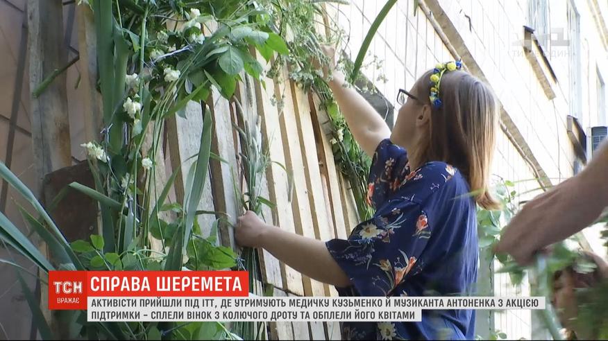 Акция поддержки во изолятором временного содержания. В зеленую воскресенье активисты пришли под учреждение, где сейчас зарешеченные Юлия Кузьменко и Андрей Антоненко, которых обвиняют в убийстве журналиста Павла Шеремета. Сплели символический венок из колючей проволоки и оплели его зеленью и цветами, чтобы таким образом поддержать заключенных.