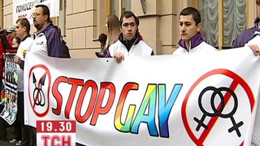 Противники гомосексуальных отношений держали плакаты с надписями: "ЛГБТ - нашим детям это не нужно", "Традиционная семья - крепость любви", "Требуем исключить из текста соглашения гомосексуальную директиву 2000/78/ЕС", "Нет - импорту извращений".
