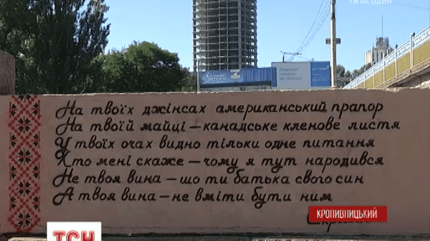 В Кропивницком распространяется флэшмоб под названием «Поэзия стен». Его авторы - молодые художники и литераторы. Для каждого стиха они подбирают локацию, которая соответствует содержанию. На Набережной - в любимом месте отдыха молодежи, появился отрывок из песни Кузьмы Скрябина. На городском совете - стихотворение Василия Симоненко «Ты знаешь, что ты человек».