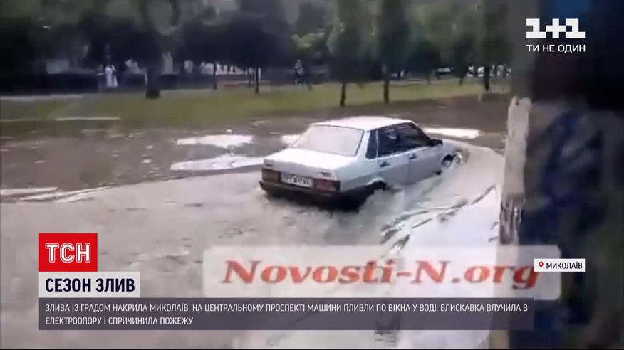 Ливень с градом и грозой в обед накрыл Николаев. С неба лило так, что через несколько минут на дорогах уже текли реки. По центральному проспекту города, расположенному в низинном районе, машины поплыли в воде по самые окна. На Ингульском мосту молния ударила в электроопору. Возник пожар. Просто под дождем загорелся столб и провода. Движение троллейбусов на этом участке остановили. Больше о последствиях непогоды смотрите в 19:30