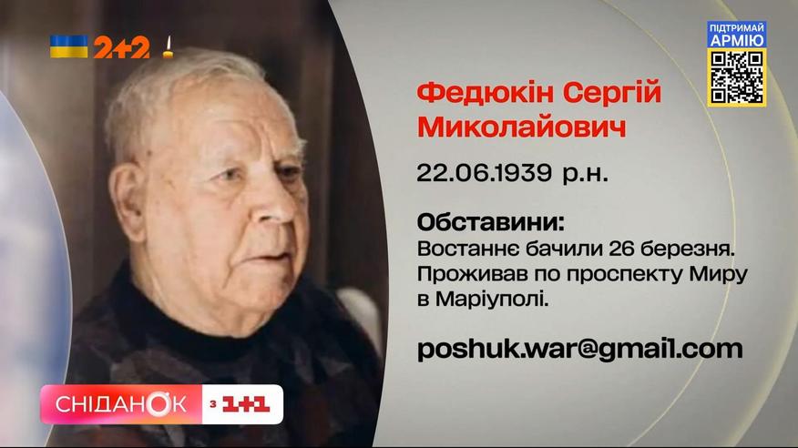 Он обожал море и отказывался покидать родной город, даже несмотря на мощные обстрелы. Это 82-летний Сергей Федюкин из Мариуполя. Одна из тысяч, кого пытаются найти через телеграмм-канал "Поиск пропавших". Социальный проект "Найти своих" создала телеведущая Екатерина Осадчая. Смотрите, кого именно ищут, и, возможно, вы сможете кого-то узнать.