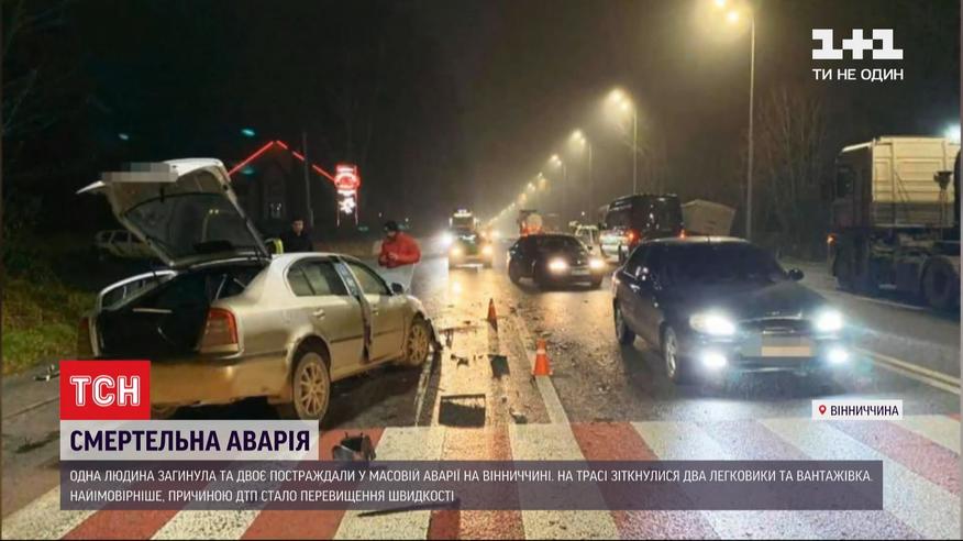 Один погибший и двое травмированных в массовом ДТП в Винницкой области. На оживленной трассе возле села Писаревка столкнулись две легковушки и грузовик. Один из автомобилей на бешеной скорости протаранил другой легковой автомобиль. Удар был такой силы, что внедорожник отбросило на встречную, где в него врезался грузовик с прицепом. Обломки были разбросаны на несколько десятков метров, а движение по трассе несколько часов было парализовано. Травмировались оба водителя легковушек, а пассажира одной из машин с искореженного металла доставали спасатели. Мужчина скончался в карете скорой по дороге в больницу.