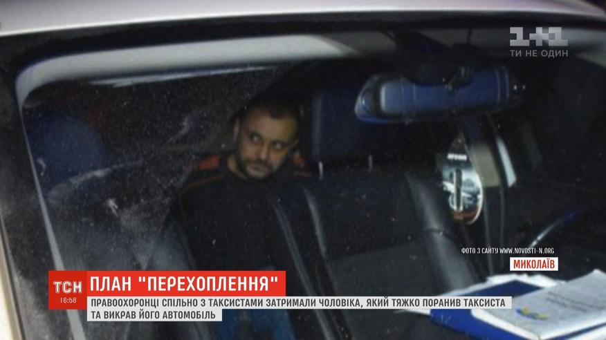План "Перехват" в Николаеве. Там искали мужчину, который похитил такси и тяжело ранил его водителя. Тот сейчас в реанимации - в тяжелом состоянии. Пассажир остановил такси, назвал адрес, но во время движения неожиданно набросился на водителя - проломил ему череп и угнал машину. Злоумышленника несколькими автомобилями такси и полиции удалось взять в кольцо. Нападающего пришлось спасать от самосуда таксистов.