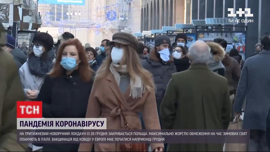 На трехнедельный новогодний локдаун закроется Польша. В тамошнем правительстве сообщили: с 28 декабря и до 17 января страна будет на жестком карантине. В новогоднюю ночь будет действовать комендантский час. А всю Италию на время зимних праздников планируют объявить "красной" зоной и ввести максимально жесткие ограничения вплоть до запрета выходить из дома без крайней необходимости. В ЕС между тем обновили список "безопасных" стран: Украины, как и ранее, в этом перечне нет. Кампанию вакцинации от коронавируса в Европе планируют начать 27 декабря, в Еврокомиссии советуют делать это одновременно во всех странах ЕС.