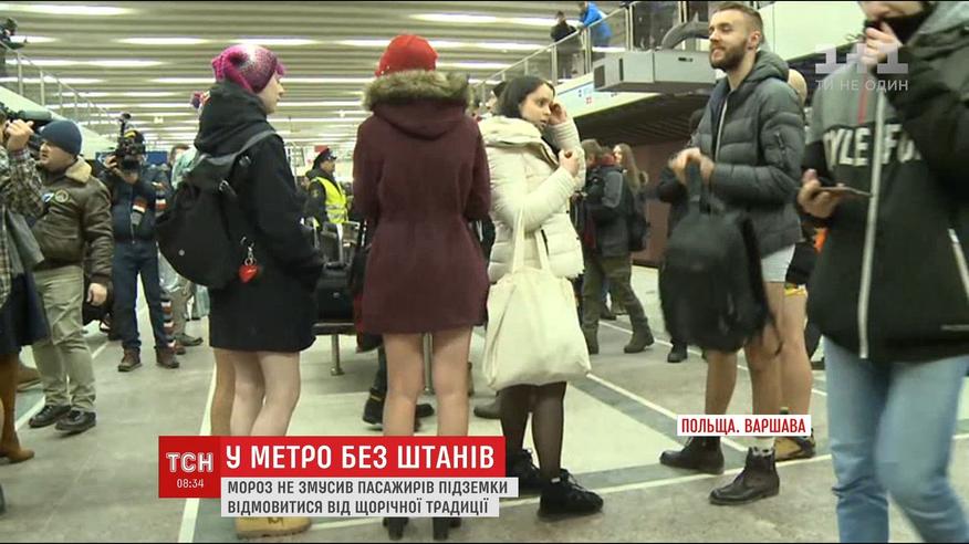 Несмотря на мороз, жители Варшавы поддержали ежегодную традицию - путешествовать подземкой без нижней части гардероба. Температура на улице опустилась до минус десяти градусов, все вокруг засыпало снегом, поэтому пассажиры были укутаны в теплую одежду. Однако некоторые из них решились остаться с голыми ногами.