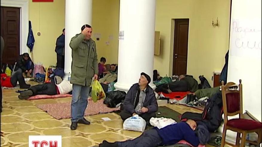 Уже три дня мэрия проводит выездные заседания. Пока на Крещатике 36 живут митингующие, чиновники возвращаться туда не собираются.