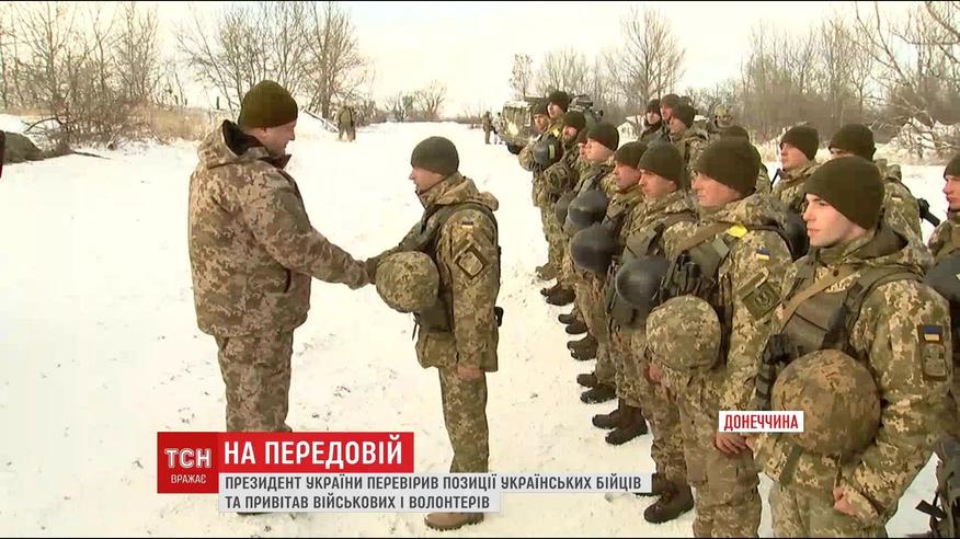 В километре от Горловки, которую контролируют боевики, Верховный главнокомандующий проинспектировал позиции украинских воинов. Президент заявил, что гордится тем, как окрепла армия за последние два года. Вспомнил и о волонтерах, которые отмечали накануне свой день.