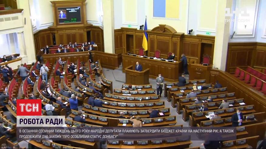 Насыщенной обещает быть последняя в этом году сессионная неделя в Верховной Раде. Завтра депутаты намерены утвердить государственный бюджет на следующий год. Его детали будут обсуждать еще сегодня, на заседании профильного комитета и фракции "Слуга народа". Также на повестке дня продление действия закона об особом статусе Донбасса, принятый 6 лет назад. Под занавес года депутаты могут рассмотреть кадровые вопросы: двое министров - образования и энергетики - находятся в статусе исполняющих обязанности.