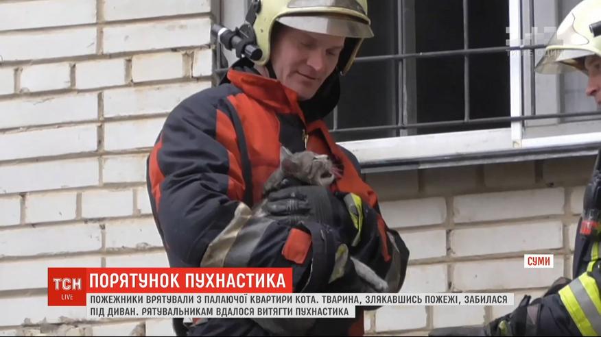 Спасение питомца. В Сумах чрезвычайники спасли из горящей квартиры четвероногого обитателя. Кот настолько испугался пожара, забился под диван. Животное пришлось выманивать и извлекать из дальнего угла. О возгорании в квартире на втором этаже пожарным сообщили случайные прохожие.