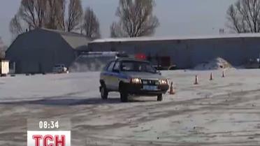 Патрульные машины соревновались, кто лучше догонит преступников на скользкой дороге. К традиционному гололеду добавили еще и искусственные препятствия.