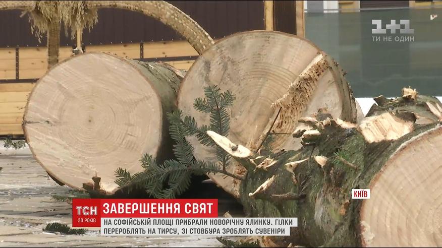 Ветви 26-метровой красавицы переделают на опилки, а ствол распыляют на тоненькие диски и продадут с аукциона. Все собранные средства организаторы передадут в лесничество на Прикарпатье, чтобы посадить там новые елки. Убрали коммунальщики и ярмарку, где встретили Новый год сто тысяч киевлян и гостей города.