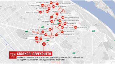 Центр лучше вообще объезжать. Кроме места проведения военного парада, это Крещатик - от Бессарабской до Европейской площади. До Бессарабки ни проехать и Большой Васильковской. Пешеходной в эти дни есть улица Ивана Мазепы - от Московской до гостиницы "Салют".