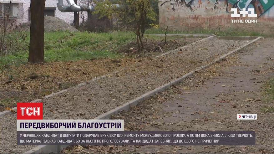 Предвыборное благоустройство. В Черновцах кандидат в депутаты подарил людям брусчатку для ремонта дворовых проездов, а потом забрал ее. Так утверждают жители нескольких домов. Они уверены, все потому, что за него не проголосовали. Зато, кандидат уверяет - к исчезновению материалов не причастен. Куда же делась брусчатка - выясняла ТСН.