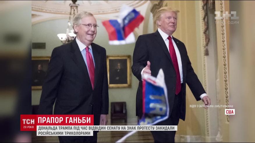 Дональд Трамп приехал в сенат, чтобы обсудить налоговую реформу. Протестующий назвал Трампа предателем и успел бросить в него горсть маленьких российских флажков, прежде чем его вывели охранники.