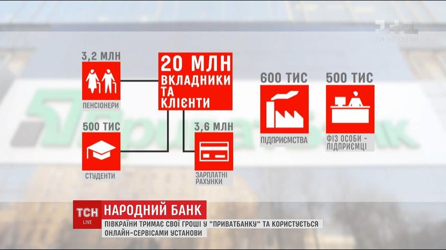По данным НБУ, свои деньги в ПриватБанке сохраняют в целом 20 миллионов украинский - это, фактически, полстраны. Среди них более трех миллионов пенсионеров и полмиллиона студентов. Более трех с половиной миллионов работников получают зарплату через ПриватБанк. Кроме того, в нем имеюь счета 600 тысяч предприятий и полмиллиона физических лиц-предпринимателей.