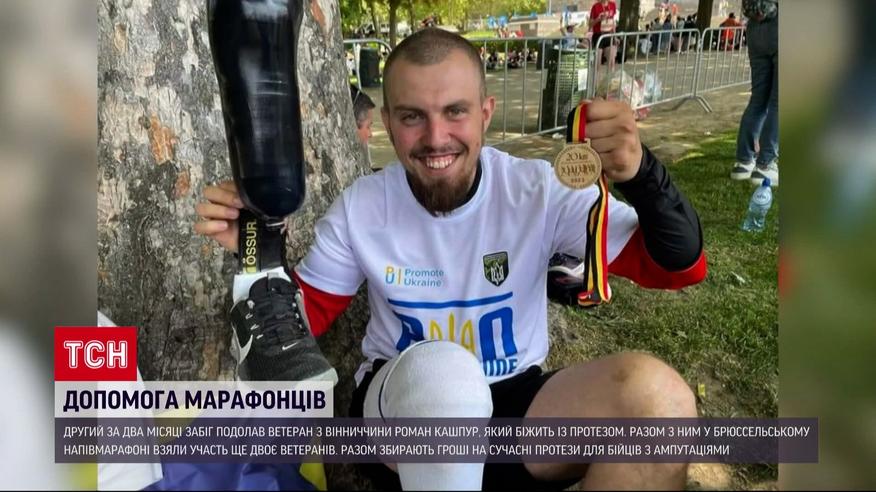 Ветеран из Винницкой области Роман Кашпур на протезе преодолел Брюссельский полумарафон. Сумел пробежать 20 километров только с одной двухминутной остановкой. Это уже второй забег Романа. В апреле он осилил вдвое большее расстояние в Лондоне и остановился только, когда начал терять сознание. Своими марафонами ветеран хочет мотивировать бойцов с ампутациями заниматься спортом и собрать деньги на современные протезы.