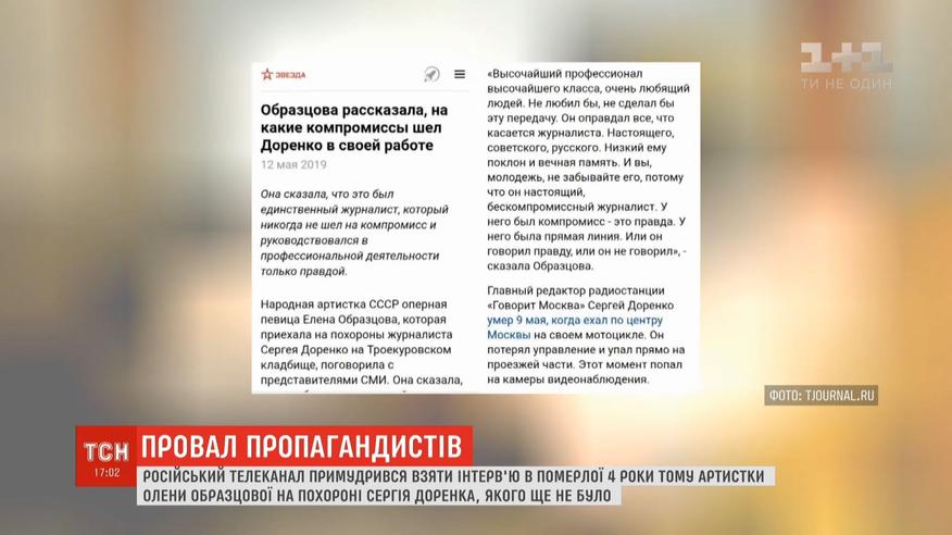 Телеканал "Звезда", принадлежащий российскому Минобороны, умудрился взять интервью у покойной артистки, да еще и во время похорон Сергея Доренко, которые еще не состоялись. Народная артистка СССР Елена Образцова, которую воскресили российские телевизионщики, якобы рассказала, каким честным и бескомпромиссным был Доренко в работе.