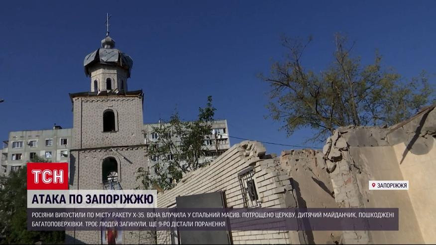В Запорожье трое погибших и девять травмированных - среди которых 11-месячный ребенок. Накануне россияне ракетой попали в спальный район города. Ударили рядом с местной церковью - она уничтожена. В многоэтажках и магазинах разбило стекла, разрушена детская площадка. Детали - в ТСН.
