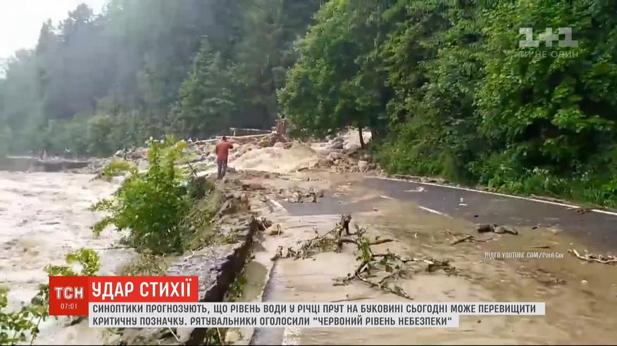 На Западной Украине уже более полусотни затопленных сел. И это не предел. Ведь ливни не прекратятся как минимум до завтра. Горные реки, которые разлились бурными потоками, срывают дамбы, разрушают мосты, заливают дороги. В курортном городе Яремче земля буквально ушла из-под ног семьи - маленький ребенок едва успел вскочить на твердую почву. Поплыл Буковель. На Буковине объявили красный уровень опасности - там сегодня уровень воды в реке Прут должен превысить критическую отметку.