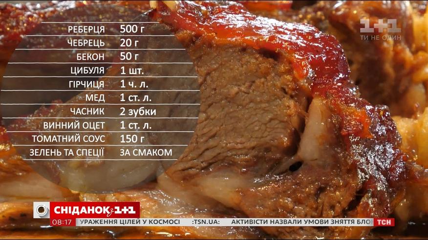Людей встречают по одежке, а пищу - по аромату. Поэтому сегодня Руслан Сеничкин приготовит фантастические ребрышки, перед которыми устоять будет невозможно. Записывайте, вам понадобится: ребрышки - 500 г, чабрец - 20 г, бекон - 50 г, лук - 1 шт., горчица - 1 ч. л., мед - 1 ст. л., чеснок - 2 зубка, винный уксус - 1 ст. л., томатный соус - 150 г., зелень и специи - по вкусу.