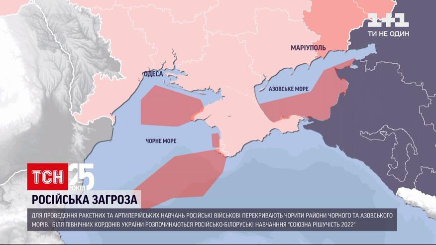 Для проведения ракетных и артиллерийских учений русские военные перекрывают четыре района Черного и Азовского морей. Речь идет об огромных акваториях. Черное море будет перекрываться в северо-западной части вплоть до 12-мильной прибрежной зоны Украины. На Азове – от побережья оккупированного Крыма до Краснодарского края. Причем никаких коридоров, чтобы торговые суда могли добраться до портов, не предусмотрено. Россияне заявили, что стрельбы в море будут продолжаться с 13 по 19 февраля. Но эксперты предполагают, что Кремль может готовить блокаду украинских портов.