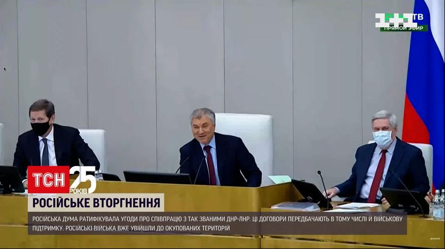 Дружба и взаимная помощь: российская Дума ратифицировала соглашения о сотрудничестве с ЛДНР. Россия признала независимость так называемых "ДНР" и "ЛНР" в границах, в которых они провозглашены - объяснили журналистам в Кремле. Полтора часа назад государственная дума России ратифицировала соглашение о дружбе с ними. Российские войска уже вошли в украинский Донбасс. В планах, по крайней мере, это определено в соглашениях, размещении там военных баз.