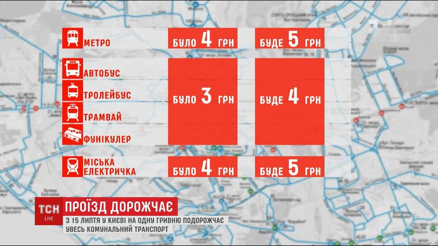 За проезд в метро будем платить вместо четырех - пять гривен. Стоимость проезда в городской электричке трамвае, троллейбусе, на фуникулере и автобусе возрастет также на гривну. Новые тарифы будут действовать уже с 15 июля.