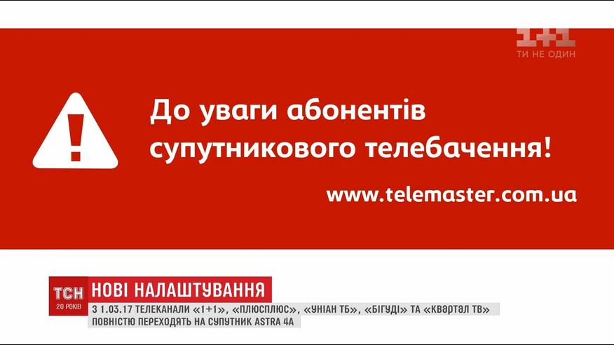 Телеканалы "1+1", "Плюсплюс", "УНИАН ТВ", "Бигуди" и "Квартал ТВ" полностью переходят на спутник Astra 4A. Чтобы продолжить просмотр любимых программ и сериалов, необходимо перенастроить ваш тюнер. Быстро и правильно ввести новые параметры поможет телемастер.