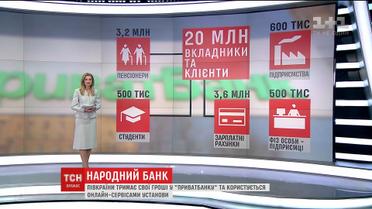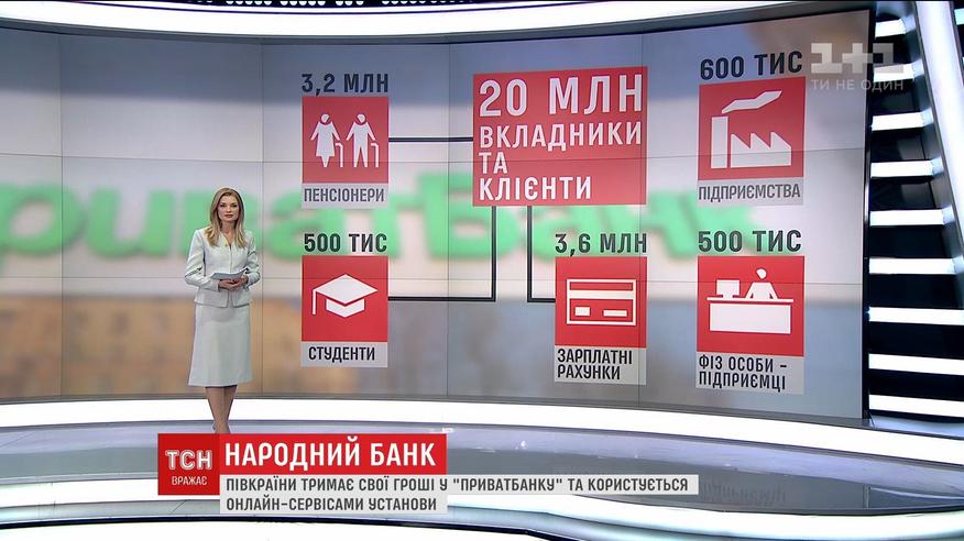 По данным НБУ, свои деньги в ПриватБанке сохраняют в целом 20 миллионов украинский - это, фактически, полстраны. Среди них более трех миллионов пенсионеров и полмиллиона студентов. Более трех с половиной миллионов работников получают зарплату через ПриватБанк. Кроме того, в нем имеюь счета 600 тысяч предприятий и полмиллиона физических лиц-предпринимателей.