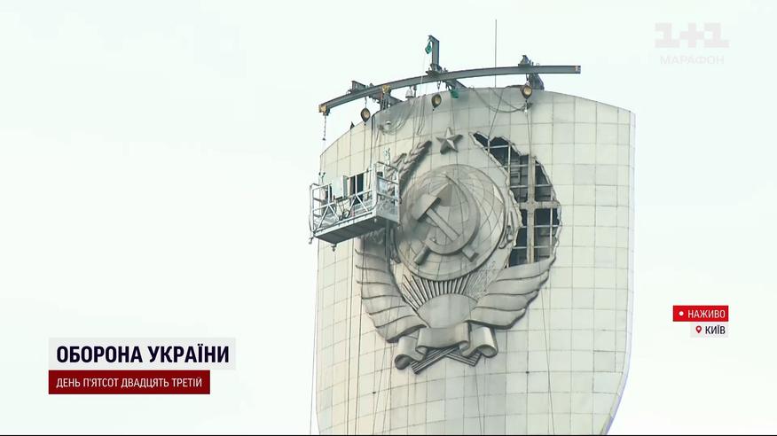 Обновление "Родины-Матери". Начались работы по демонтажу коммунистического герба на щите монумента. Эти работы из-за шквального ветра несколько раз переносили. И вот накануне строители смогли начать демонтаж. Уже удалось снять одну-пятую с того, что нужно убрать. 31 июля утром работа продолжена. Этот процесс, как и установление украинского трезубца, в Министерстве культуры обещали завершить ко Дню Независимости. Стоимость проекта – 28 миллионов гривен.