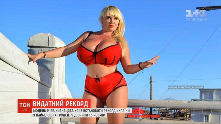 Идет на рекорд. Модель пышных форм Мила Кузнецова подала заявку на украинский рекорд самой большой груди. Девушка от природы имеет 13 размер и считает, что среди украинских женщин это - самый большой. Представители книги рекордов проверят эту информацию, и если это действительно так, то девушка получит заветное звание.
