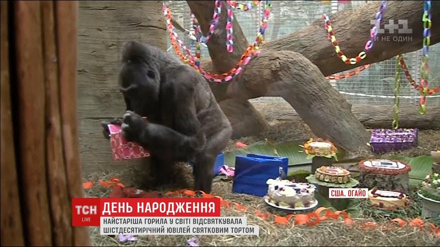 Коко, который живет в зоопарке в Огайо, исполнилось шестьдесят лет. По этому случаю для именинницы подготовили праздничный торт и подарки. Коко стала первой гориллой в мире, которая родилась в зоопарке. Обычно эти животные в неволе живут от 30 до 40 лет, и Коко превзошла уже все мыслимые рекорды. За свою долгую жизнь она трижды стала мамой, 16 раз - бабушкой, и 12 раз - прабабушкой.