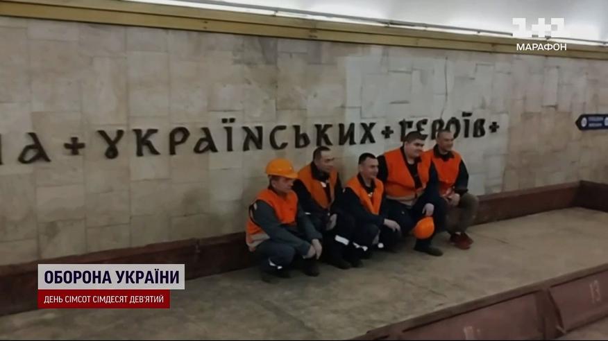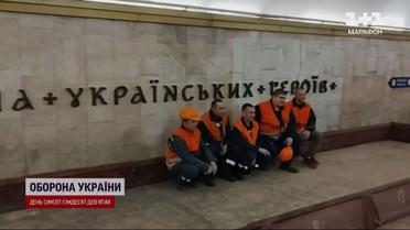 Новая стилизованная вывеска на переименованной станции метро в Киеве. Вместо бывшей "Площади Льва Толстого" установили новое название - "Площадь украинских героев". Это самое длинное название среди станций киевской подземки - длиной в 26 букв. Монтировали их всю ночь. Ведь только тогда не ездят поезда метро и нет напряжения. Вес одной алюминиевой буквы - примерно три килограмма. Киев переименовал две станции подземки еще год назад. Эту, а еще "Дружбы народов" на "Зверинецкую". Всего на каждой станции необходимо установить четыре таких надписи.