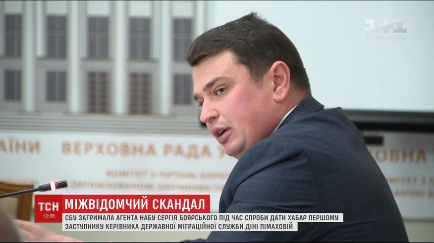 Очередной скандал между антикоррупционными и силовыми ведомствами. Служба безопасности Украины и Генпрокуратура сорвали спецоперацию НАБУ. Так в Национальном антикоррупционном бюро прокомментировали вчерашнее задержание их агента. Накануне СБУ задержала мужчину, который пытался дать взятку в 15 000 долларов первой заместителя государственной миграционной службы Дине Пимаховой, за легализацию в Украине граждан, которых не существует.