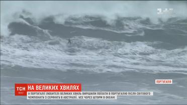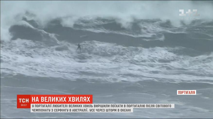 Из-за шторма волны на побережье Атлантического океана достигают 15 метров. Поэтому любители покататься на досках решили еще несколько дней позаниматься любимым делом. На умелых серфингистов пришли посмотреть и десятки местных жителей.