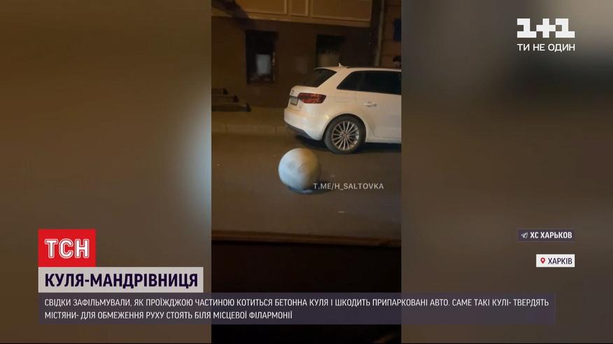 В центре города водители зафиксировали, как проезжей частью катится бетонный шар и бьет припаркованные авто. На видео видно: тяжелый шар - такие обычно ставят на дорогах, где запрещено движение - кружит дорогой. И по очереди вредит припаркованным машинам. Только видео попало в сеть, шар опознали. Под постом горожане пишут, что именно такие ограничители движения стоят на парковке возле харьковской филармонии.