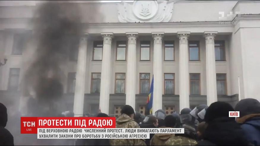 В первый рабочий день после отпуска в парламенте обсуждают законопроект о реигтеграцию и деоккупации Донбасса. Под стенами Рады сторонники Михаила Саакашвили подожгли флаг Российской Федерации. Вместе с ним загорелись шины.