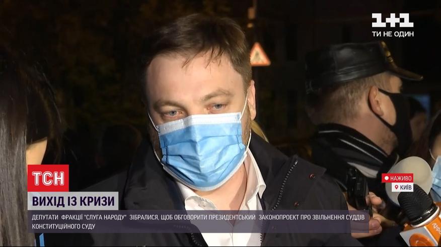Выход из конституционного кризиса в эти минуты ищет Президент Владимир Зеленский вместе с фракцией "Слуга народа". Ей предшествовало решение судей КС об отмене обязательного е-декларирования. На встрече должны обсудить президентский законопроект об увольнении судей Конституционного суда.