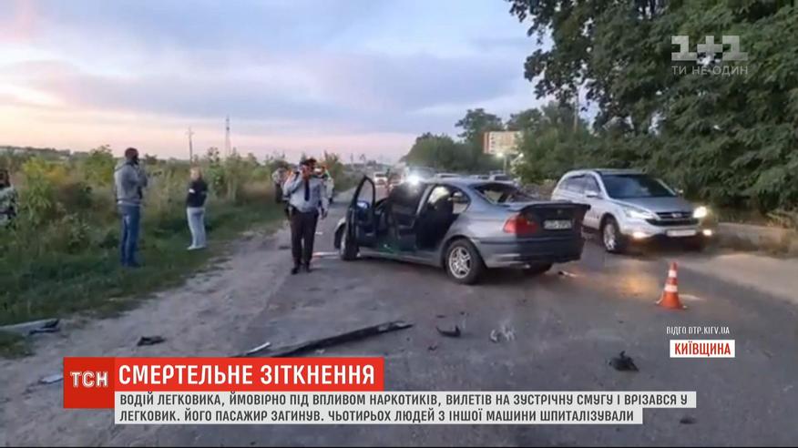 Под Киевом водитель якобы под воздействием наркотиков вылетел на встречную полосу и протаранил легковушку. От удара машины разлетелись друг от друга на несколько метров. Водитель-нарушитель серьезных травм не получил, а вот его пассажир погиб на месте. В салоне другой машины было четыре человека, всех доставили в больницу с травмами различной степени тяжести.
