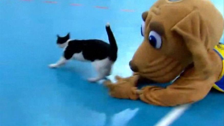 Собака-талисман погналась за котом во время баскетбольного матча