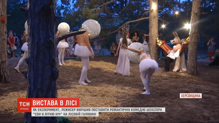 Спектакль в лесу под Херсоном. Под открытым небом поставили "Сон в летнюю ночь" по пьесе мирового классика. Минимум декораций, а вместо сцен - лесные поляны. Больше смотрите в сюжете.