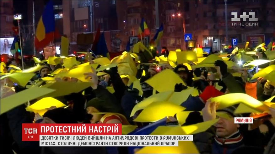 Протестующие принесли с собой куски ткани и фонарики, создав гигантский национальный флаг. Массовые протесты с требованием отставки правительства прошли и в других крупнейших городах страны. На румынский площадь люди выходят уже почти две недели, причиной протестов стал скандальный закон об амнистии.